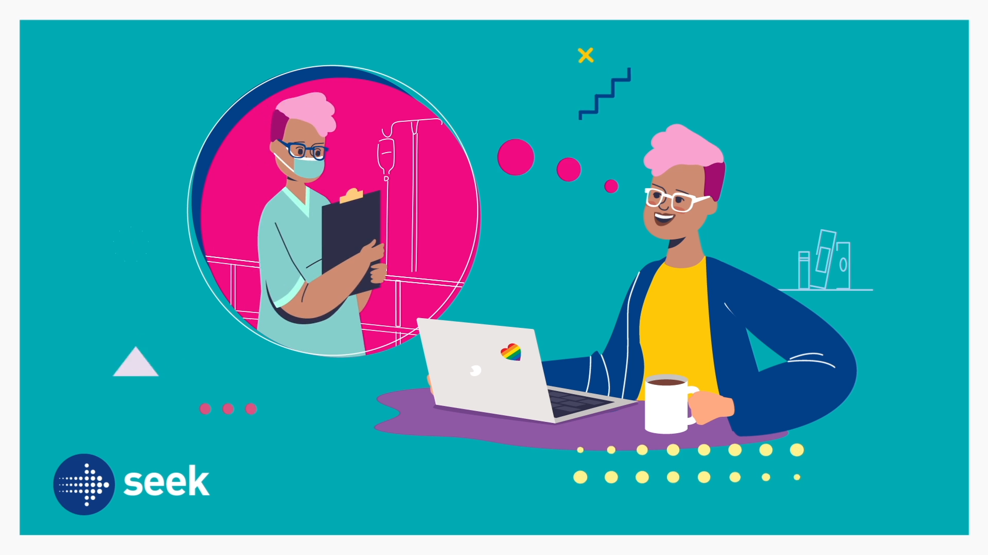 One of the challenges was designing relatable characters that would adequately reflect the broad diversity of the LGBTIQA+ community. I worked with SEEK to establish the character design for the various scenarios depicted, then developed the treatment for the typography and other graphic elements. The goal was to meld the largely character-driven scenes with secondary graphic elements to keep it engaging and drive home the key messaging.